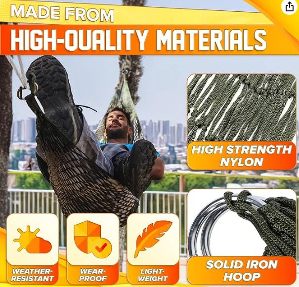 Wiszący hamak wędrówki, ten nylonowy hamak struny ma wysoką pojemność obciążenia. Ten nylonowy hamak linowy jest idealny do wewnątrz i na zewnątrz ze względu na wysoką trwałość i odporna na zużycie