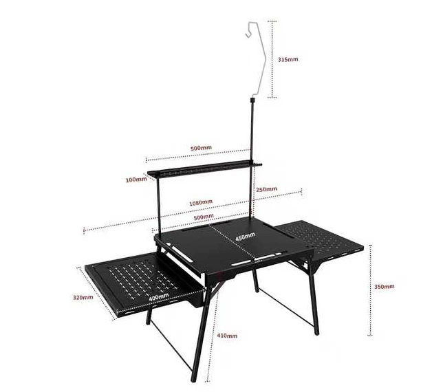 Przenośny składany aluminiowy stół kempingowy, platforma do stolika jadalnego składa się z górnej, środkowej i dolnej części, z wystarczającą przestrzenią do przechowywania wszelkiego rodzaju zastawy stołowej, żywności i przypraw.
