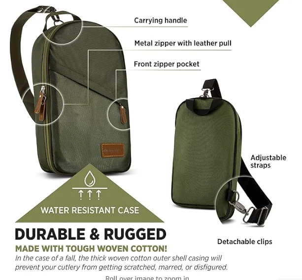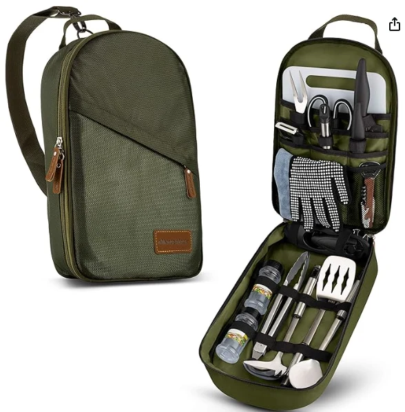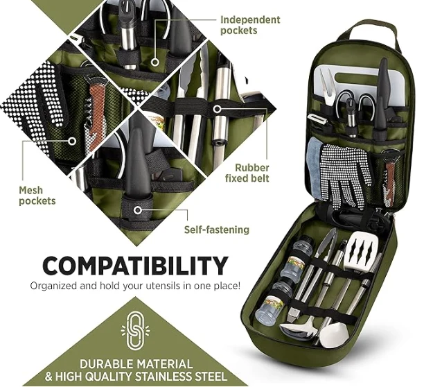 Przenośna torba na narzędzia na zewnątrz, każde przybory ma własną wyznaczoną torebkę, więc jednostki nie są rozmazane, porysowane ani uszkodzone podczas przechowywania lub w transporcie. Zapewnia łatwy dostęp do przyborów kuchennych i jest wyposażony w bezpieczną uszczelkę zamka